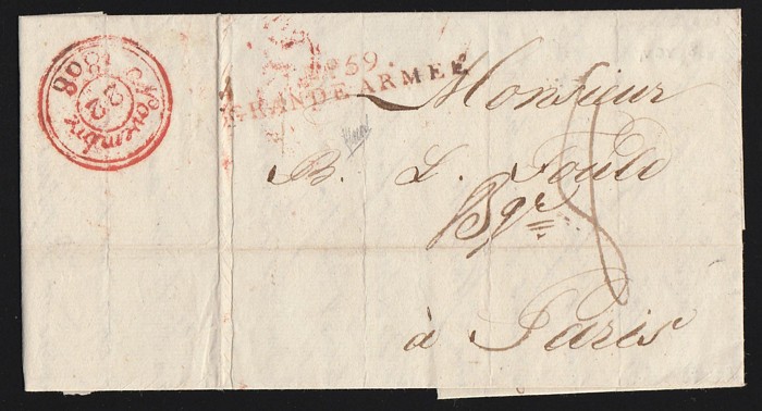 'Grand Armee' occupation of Danzig (Gdansk, previously in Kingdom of Prussia, then Free City of Danzig under Napoleon, now in Poland). Folded letter headed 'Dantzig 8 Novembre 1808' with 'No.59 GRANDE ARMEE' 2-line red pmk, '8' m/s postage rate, to