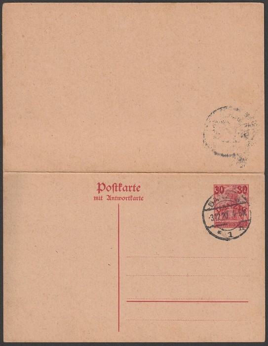 Double Reply Postcard 30pf on 10pf & 30pf on 10pf red. Front CTO, return UN. Mi P9 cat €70 for U. (Image1) (Image2)