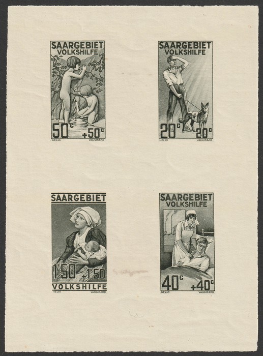 set 20+20c - 1.50+1.50Fr composite imperf PROOF sheetlet in dull mauve, issued colour on normal paper (102x132mm). VF fresh M in margin, stamps MNH. SG 104-107(p). Mi 104-07PKLB cat €750 for M or €1500 MNH (singles would still cat