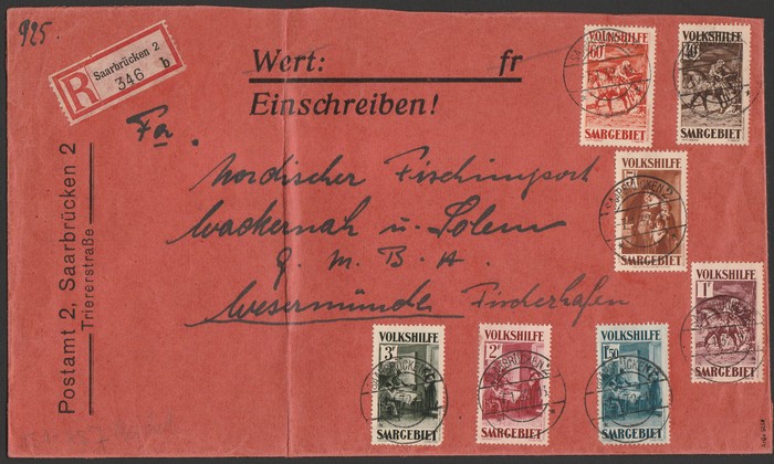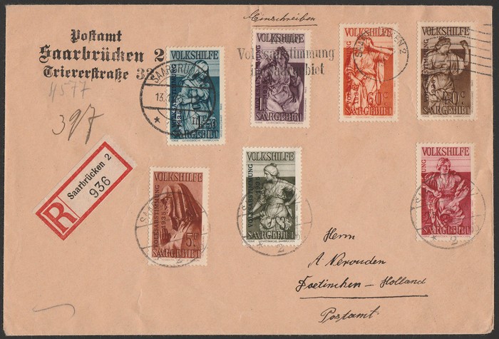 Charity set 40c+15c - 5Fr+5Fr, on regist cover, tied by '18.1.35 Saarbrucken' cds & machine cancel. VFU. Mi 199-205 cat €240+. SG 169-175 cat £375+, both as loose stamps. (Image1) (Image2)