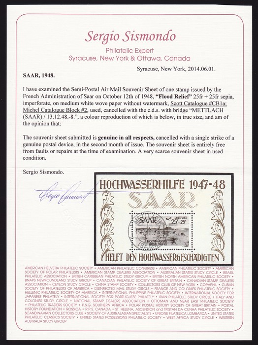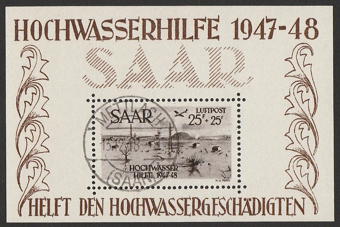 Fund Airmail M/Sheet. Superb U with perfect strike 'Mettlach (Saar) 13.12.48' cds. Mi Blk 2 cat €2400+. Sc CB1a cat US$2000+, SG MS 256a cat £3000+. Extremely scarce with genuine pmk. 2014 Sismondo photo cert. (P) (Image1) (Image2)