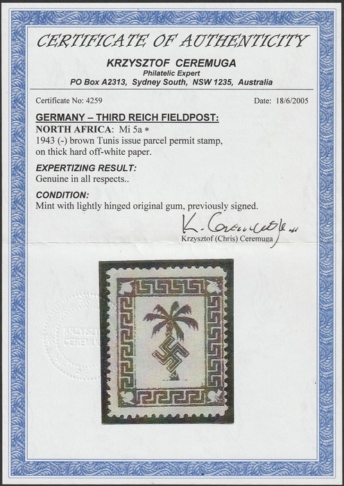 Fieldpost: 1943 brown Tunis issue Parcel Permit stamp on thick hard off-white, perf. F-VF fresh MLH, almost MNH. Mi 5a cat €400. Rare genuine. 2005 Ceremuga photo cert. (P)