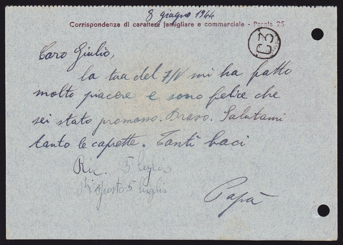 Islands-Rhodes: 1944 Rodi 30c brown on bluish illustrated Postal Card (1st half of double reply card) -file punches at left, with Italian & German text, uprated Rodi Wing 50c with 'Posta Aerea 9 6 44' cds. To Italy, with censor h/s in red, & 2 other
