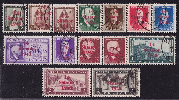 Shtator 1943' opt Pictorial set 1q on 3q-3Fr, plus Express 25q. VFU with 'Peje 20.4.44' cds. SG 389-E402 cat £600, Mi 1-14 cat €500. Rare in used condition. 2014 Ceremuga photo cert. (14). (P) (Image1)