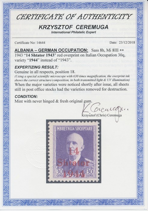 Shtator 1943' opt King 30L bright violet, error '1944' instead of '1943'. VF fresh MNH. SG 396(var), Sass 8h, Mi 8III cat €450. Important error. 2014 Ceremuga photo cert. (P)