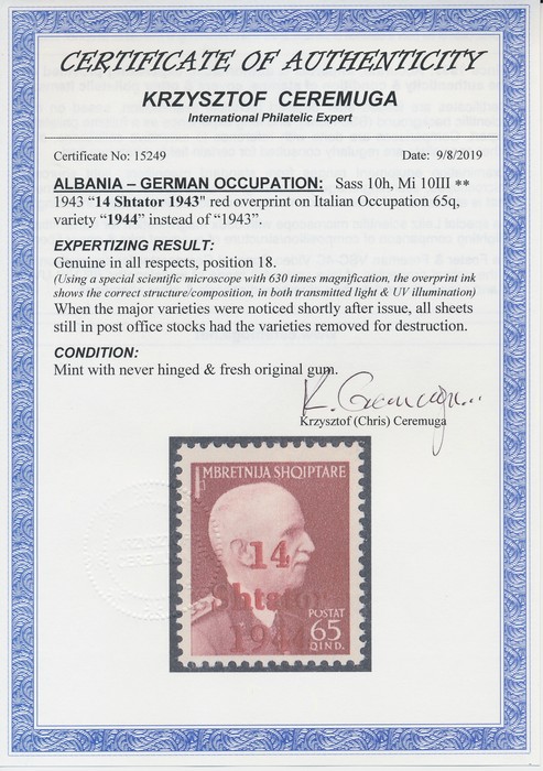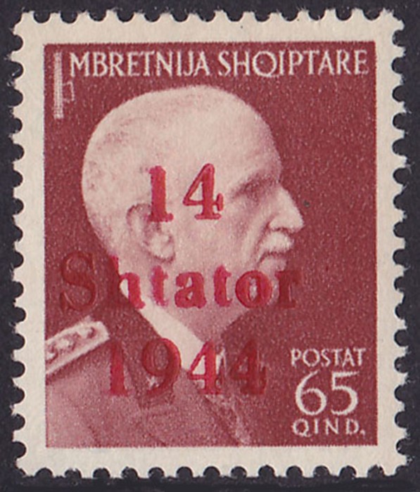 Shtator 1943' opt King 65q brown-lake, error '1944' instead of '1943'. VF fresh MNH. SG 398a cat £60 for M, should be at least double, £120 MNH, Sass 10h, Mi 10 II cat €450. 2014 Ceremuga photo cert. (P) (Image1) (Image2)