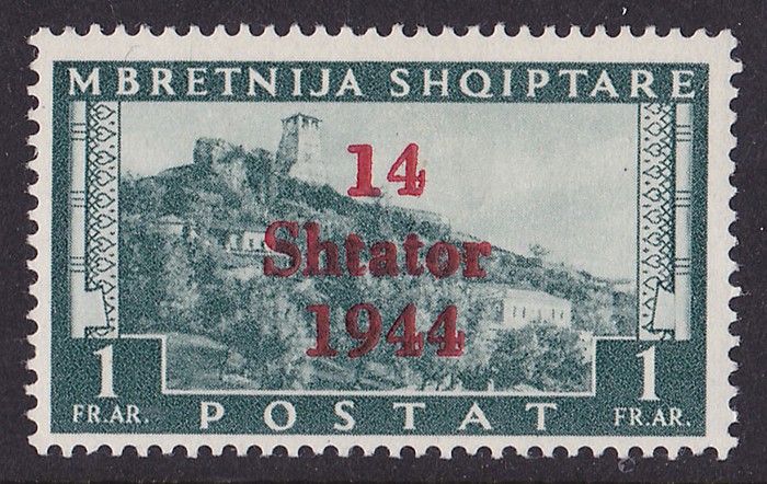 Shtator 1943' opt Pictorial 1Fr blue-green, error '1944' instead of '1943'. VF fresh MNH. SG 399a cat £350 for M, should be at least double, £700 MNH, Sass 11h, Mi 11III cat €500. Important error. 2014 Ceremuga photo cert. (P) (Image1) (Image2)