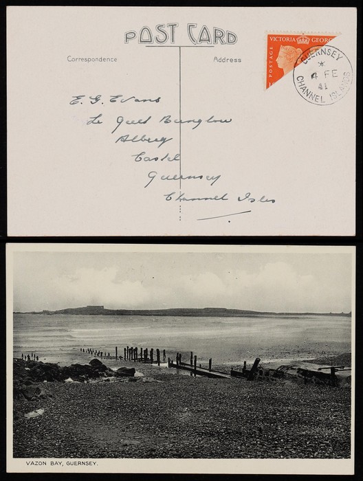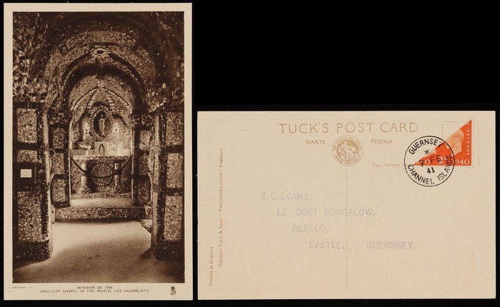 Guernsey: 1941 bisect Provisional PPC Interior of Chapel, & Vazan Bay, franked Stamp Anniv 2d 'matching' UL & LR halves, tied by 'Guernsey Channel Islands' cds of 4 FE & 7 FE. SG Spec GW9 cat £80, plus premium for PPC. (2) (Image1) (Image2)