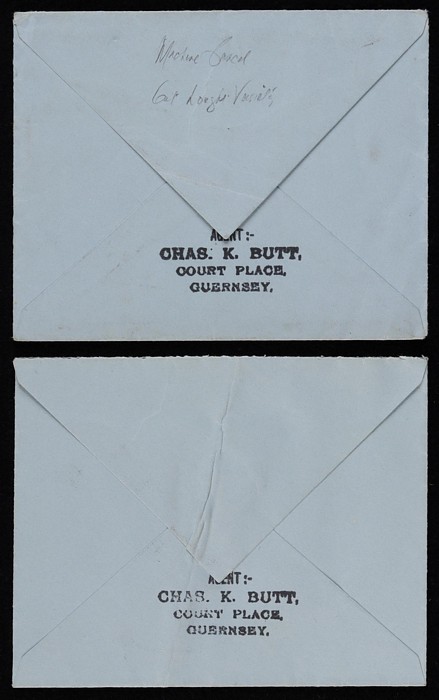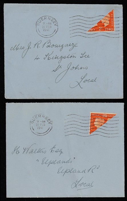 Guernsey: 1941 bisect provisional covers franked Stamp Anniv 2d 'matching' UL & LR halves, tied by 'Guernsey' machine pmks of 20 Feb 1941. SG Spec GW9a cat £90. (2)