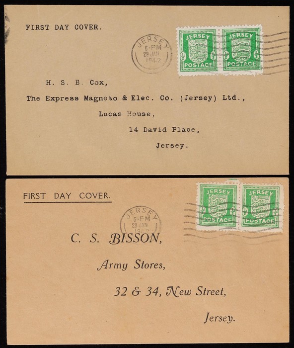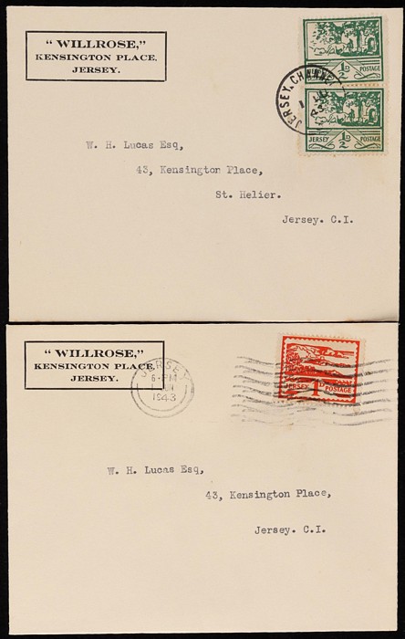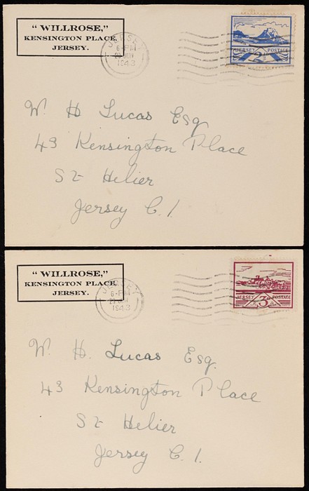 Jersey: 1941-44 covers with Arms ½d prs on 2 covers, 1d pr non-FDC cover, then 1943-44 Pictorials matching 'set' of covers all with 'Willrose Kensington Place Jersey' sender imprint at UL the ½d a pr, others singles, all FDI Jersey