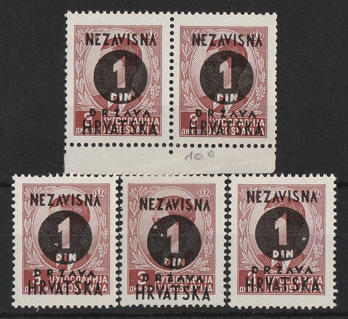 1D/3D lilac brown, with variety 'dot before 1' (pos 70), horiz pr with variety 'growth on N' (pos 100), plus 2 other singles with unlisted varieties. VF fresh MNH. Mi 41II, 41III & 41(var) cat €138. (5). (Image1)