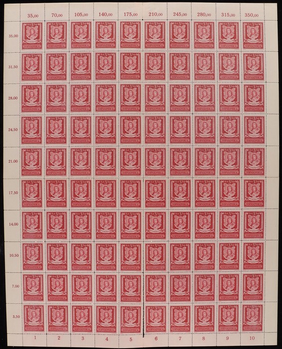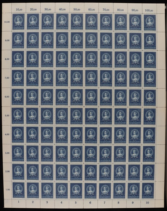 group of sheets with 1941 Waterfall 0.50K, 1943 Portrait set 1K, 2K & 3.50K & 1944 War Fund 1K & 2K, all full sheets of 100, the 0.50K with varieties 'bent tree' TPI (pos 4, 9, 54, 59) & 'above HR', TP III (post 23). VF fresh MNH. Mi 48/48(var),