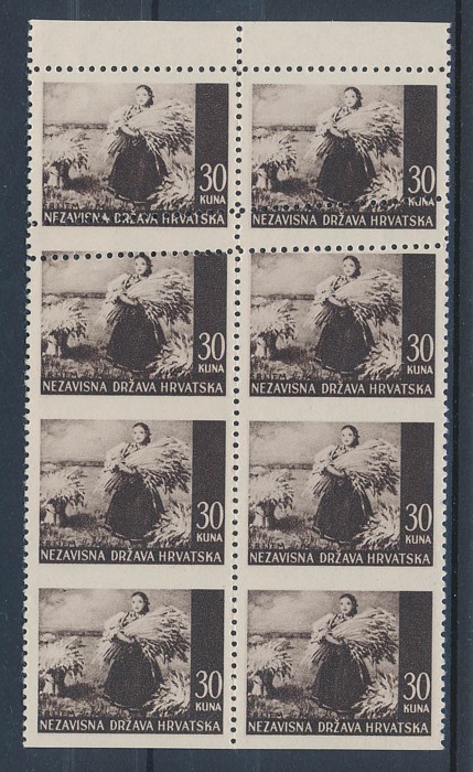 Def Views 30K Harvesting vert blk of 8, error double horiz perfs on top pr, plus imperf horiz on lower 3 prs. VF fresh MNH. SG 48(var), Mi 63UMw. (Image1)