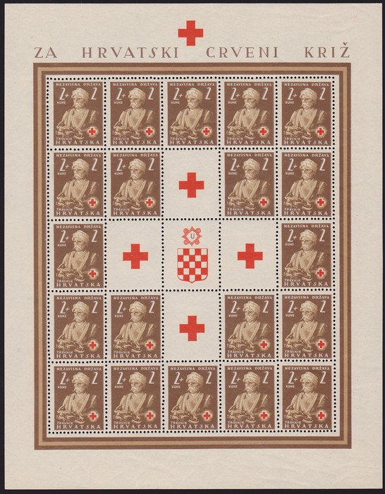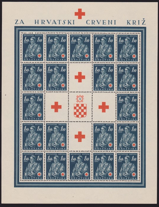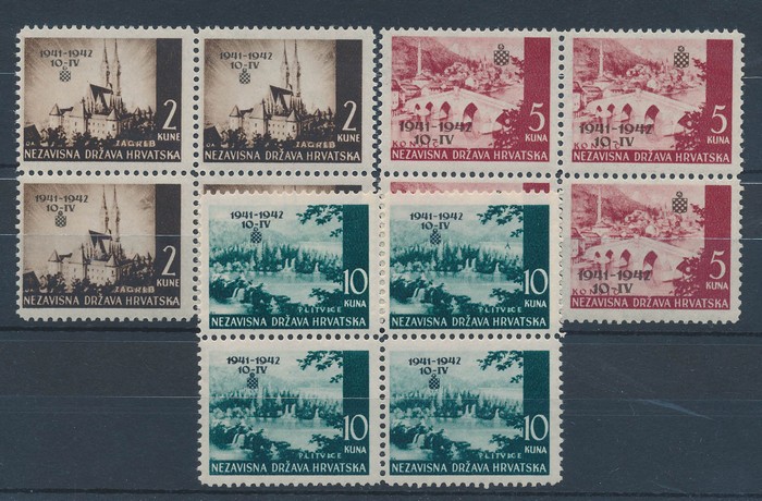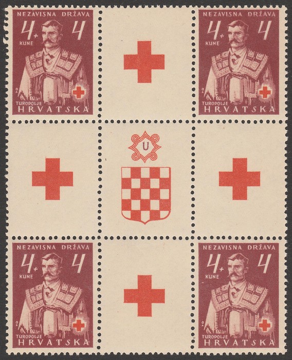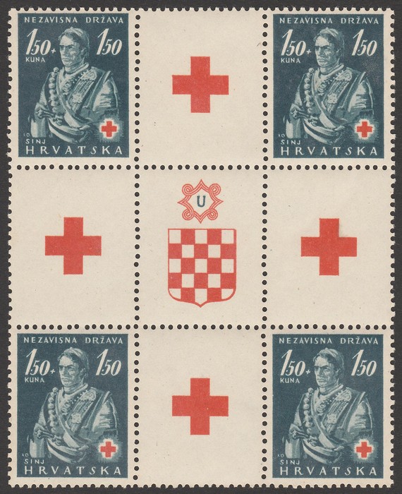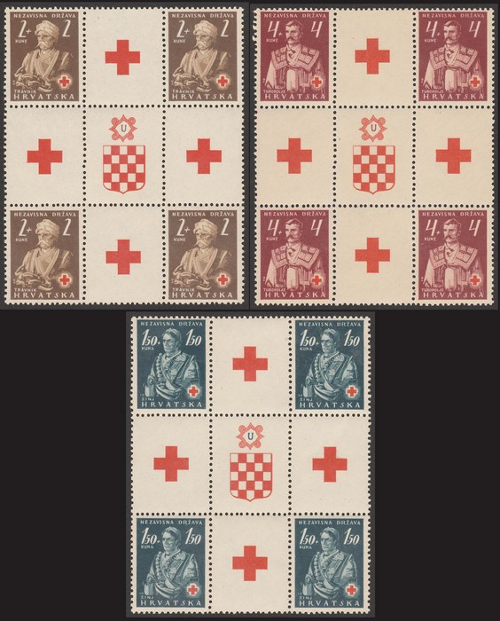 Cross set 1.50+1.50K - 4+4K ea in a central gutter blk of 4 with 4 red cross labels, plus a central shield label, the 2k+2k variety 'cross' (pos 9) engraver's secret mark. VF fresh MNH. SG 51-53(var). Mi 66-68zf1+zf2 & 67I cat €100+. (3 blks) (Image1) (Image2)