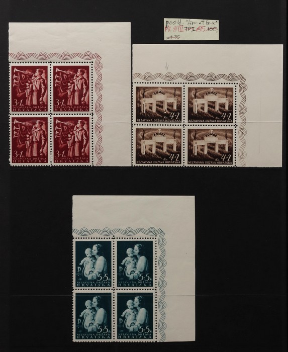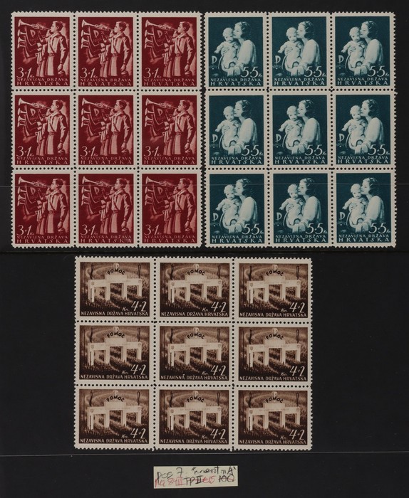 National Relief Fund set 3+1K - 5+5K 4K cnr marginal blks of 4, 4K variety 'fire at base' (pos 4). Also set in blks of 4, 4K variety 'account on A' (pos 7), plus set in blks of 4, 4k varieties 'cross on D' (pos 11) & '1 for K' (pos 16). VF fresh MNH.