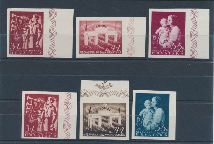 Relief Fund set 3+1K - 5+5K IMPERF in issued colours, plus set of diff colours proofs. VF fresh UN. SG 64-66(var), Mi 83-85U & 83-85P cat €225+. (6). (Image1)