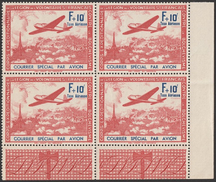 1942 French Legion on Eastern Front set Airmail F(+10F) green & red, & F+10 red & blue with OSTFRONT opts both in UL cnr blks of 4, 2nd with variety 'F broken base' (pos 1). VF fresh MNH. Maury 4-5(var). Mi IV-V inc VPF III cat €400+, plus
