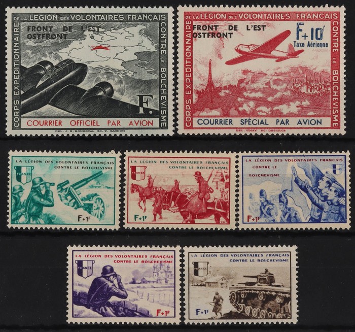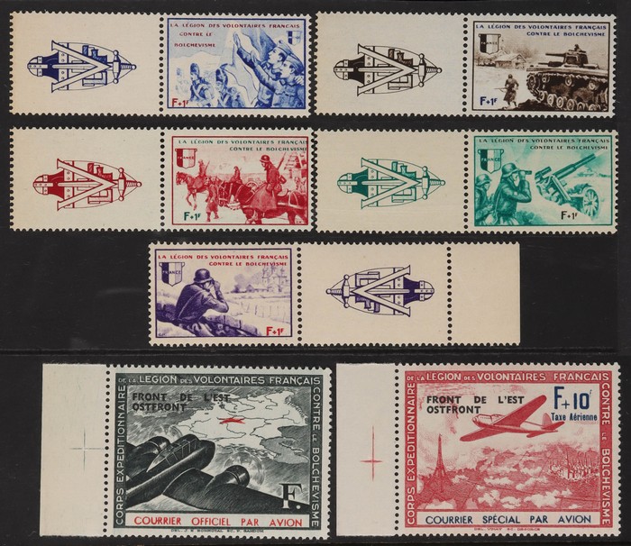 1942 French Legion 'OSTFRONT' opt set of 2, plus 1942 Battle Scenes set of 5 with stamp-sized LVF shield tabs. Superb fresh MNH. Yv 4-5 & 6-10. Mi IV-V & VIZf-XZf cat €150. (7) (Image1)