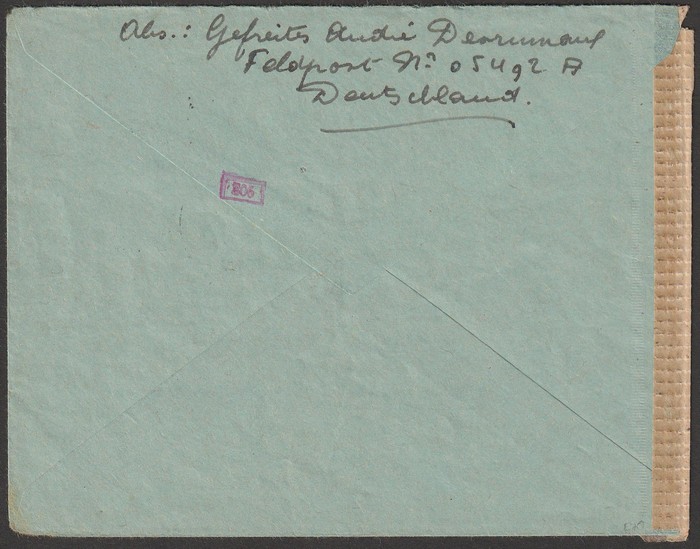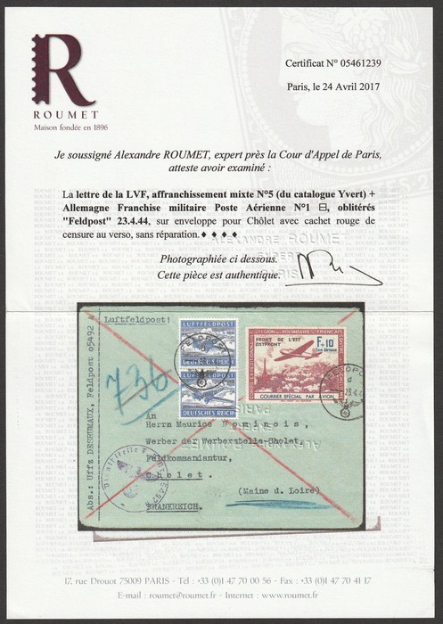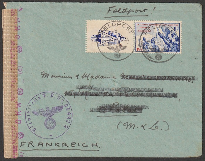 French Legion on Eastern Front Airmail F+10 red & blue with OSTFRONT opt, plus German Fieldpost Luftfeldpost blue pane (2), tied by 'Feldpost d 23 4 44' cds to cover (centre fold) with 'Dienstelle F.P. Nr 05492A' cachet at LL (of the 3rd Battalion of