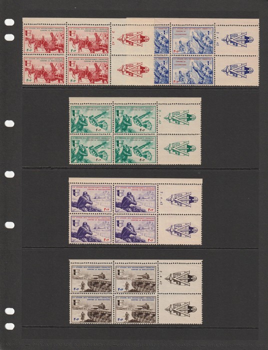 1942 French Legion on the Eastern Front battle scenes F+1F with printed tabs. Issued by French Legion Against Bolshevism. Blks of 4 with dated & undated pictorial tabs. VF fresh MNH. Maury 6-10. Mi VI-XZfBr cat €800. (5 blks) (P) (Image1) (Image2)