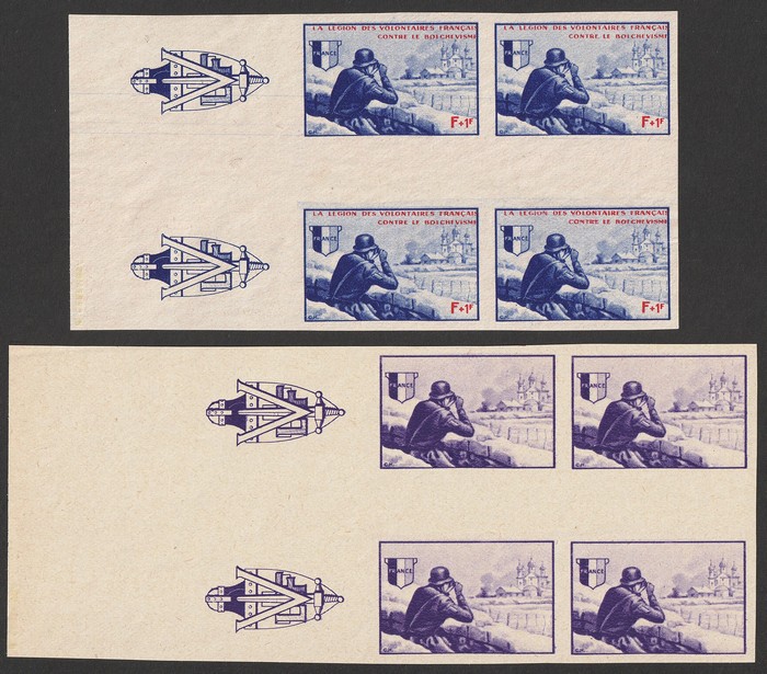 1942 French Legion on the Eastern Front battle scenes F+1F charity stamps with Watch over Moscow design of soldier looking over the front lines imperf proofs in blue with & w/o red text & in violet w/o text, all UR imperf blks of 4 with pictorial