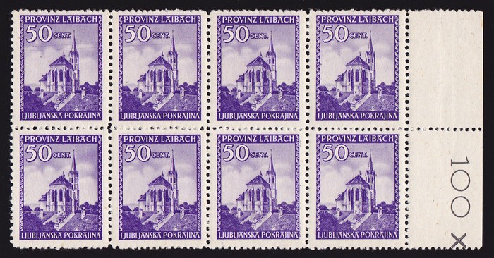 1945 Church 50c violet, right marginal blk of 8, UL 2 stamps variety '2 telegraph wires by church tower.' Superb fresh MNH. SG 122/122(var), Mi 49/49I cat €289++ as singles. Scarce positional blk. (8). (P) (Image1)