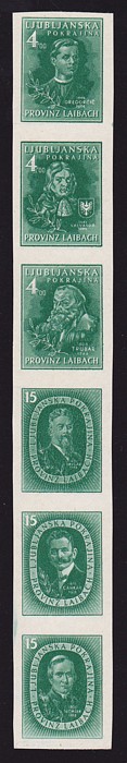 1945 Famous Slovenes set 15c & 4L green, vert se-tenant strip of 6 with 3 diff 4L & 3 diff 15c designs, imperf. Unissued due to the defeat of the Third Reich. Superb fresh MNH, all 4 margins. Mi IB-VIB cat €400. Rare! 2014 Ceremuga photo cert.