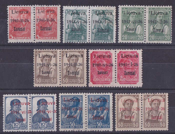 Zarasai: 1941 RED & BLACK opt range 5k-60k, all horiz prs, all either se-tenant opt types or Mi listed varieties se-tenant with normals, such as 'Lie uva instead of Lietuva', '1941- I-26 instead of 1941-VI-26' etc. VFU/CTO, light 'per favour' cds. Mi