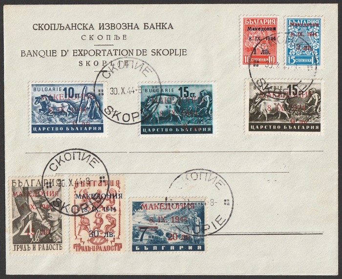 3-line opt Pictorial set 1L/10st - 30L/40L tied to envelope by 'Skopie 30 X 44' cds. The 15L/4L & 30L/40L opt type I, others type II. SG 1-8 cat £475+ as loose stamps. Mi 1-8 cat €500 for set on such CTO cover. 2006 Ceremuga photo cert.