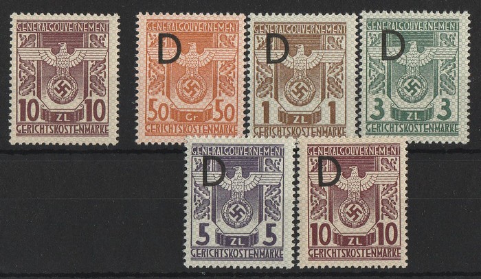 Govt: 1942 Court Fee revenue 10zl,, plus 1943 'D' opt Court Fee set 50gr-10zl. VF fresh MNH. Bft 13 & 14-18 cat £150+ as M or U, plus premium MNH. (6) (Image1)
