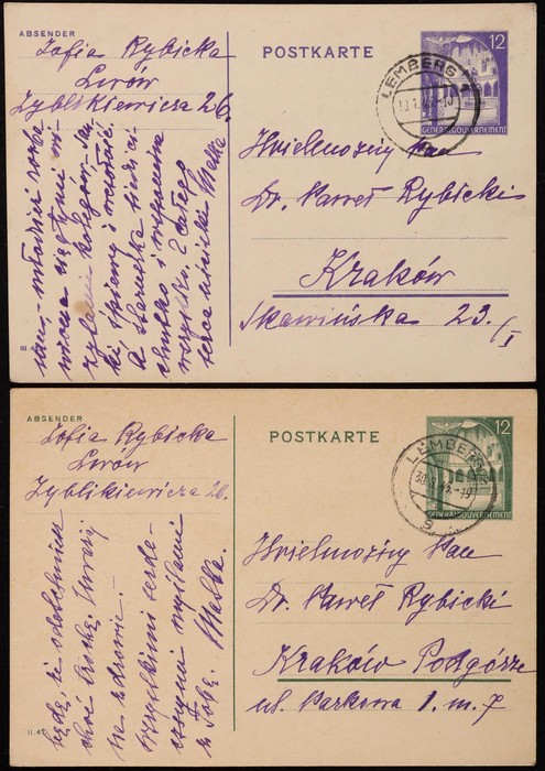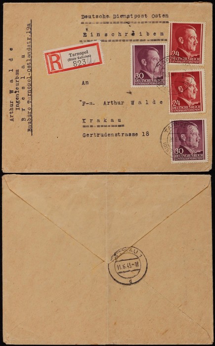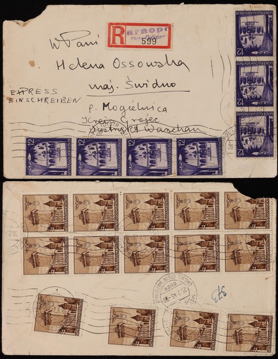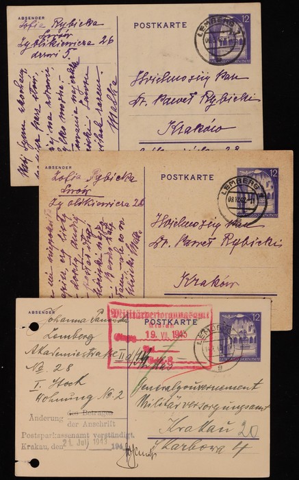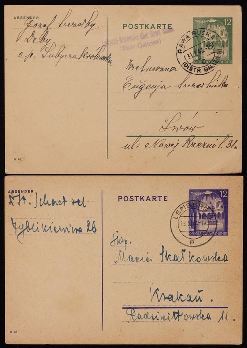 1942-44 covers & cards inc Gen Govt 12gr lilac Postcards (3), 1 with uprating for Express Lemberg-Krakow, 12gr green Postcard Lemberg-Krakow & 24gr red Envelope with Lemberg cds. Mi U2(01), P10 & 12 (01/02) cat €54+++. All from towns in eastern