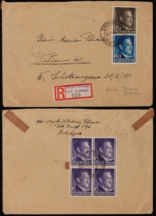Govt: 1940-43 covers & cards inc Registered, Official & Express. All from towns in eastern Poland now in Ukraine with pmks of Lemberg (9) inc 12gr green or violet postcards, pmks of Drohobycz, Nadworns, Przeworsk, Rawa Ruska, Sanok, Stryu & Tarnopol,