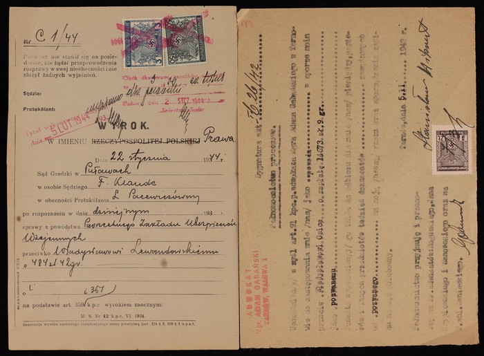 Govt: 1940-44 legal documents with various Stamp Duty & Court Fee revenues to 5zl, inc mixed frankings. Mostly F-VF. Interesting lot. (11 docs) (Image1)