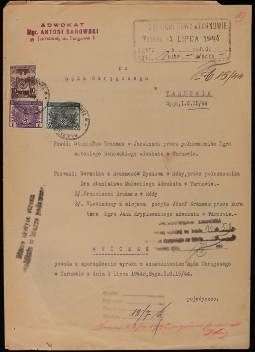 Govt: 1941 legal document franked 1939 Court Fee revenues 1zl (4), 5zl & 10zl, with red h/s. Bft 3, 5 & 6 cat £33+ as loose stamps alone. Attractive. (Image1)