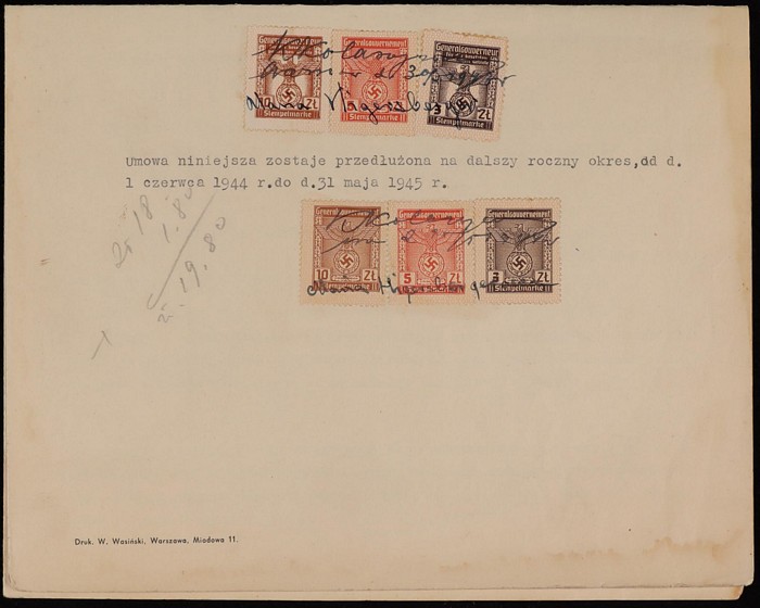 Govt: 1943-45 contract document franked 1939 Stamp Duty revenues 3zl & 10zl, plus 1940 5zl, & endorsed 2nd time in 1945 with 1940 3zl, 5zl & 10zl, tied by m/s dates. Bft 6, 10 & 16-18 cat £37+ as loose stamps alone. Attractive. (Image1)