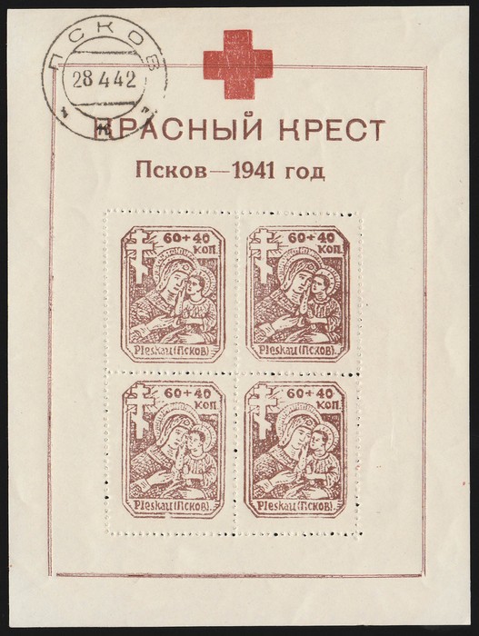 1942 Red Cross Madonna 60+40K M/Sheet with Red Cross, on white paper, no wmk, perf 11¾. VFU, Pskov '28.4.42' cds in top L cnr as issued, MNH gum on stamps & MLH margins, size 114x154mm. Mi Blk 4Z cat €800. Only total 2645 printed. 2017