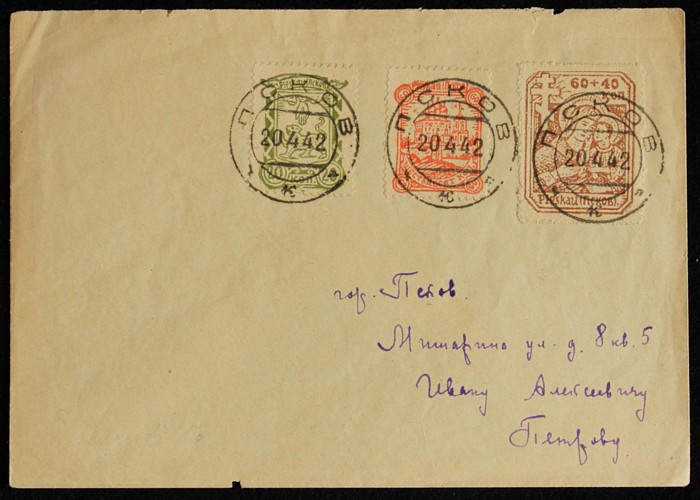 1942 cover franked Arms & Church set 20k & 60k green & red, plus Madonna 60+40k brown, tied by 'Pskov 20 4 42' cds. Mi 14A-16A. (Image1)