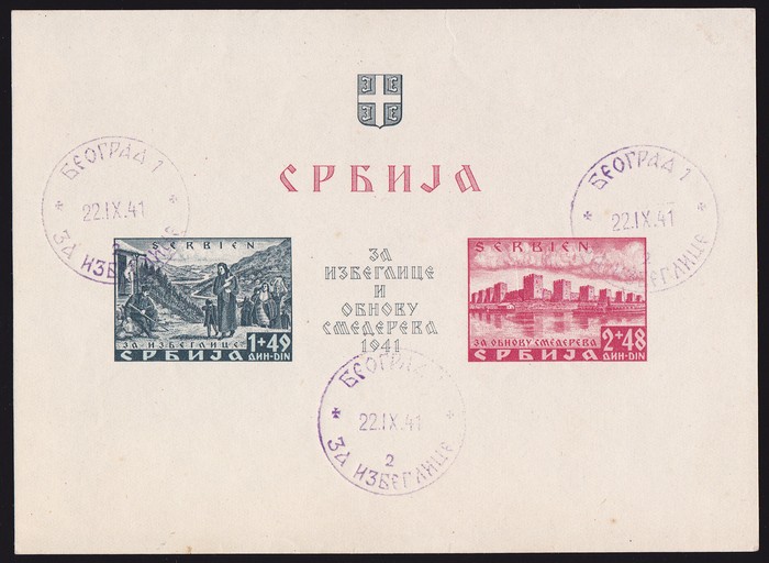 Smederovo Explosion M/Sheet imperf. VFU with 'Beograd 1 / 22.IX.41' special violet First Day of Issue cds, some tiny tone spots on reverse, with gum as removed from special presentation card. SG MSG49b cat £1200+, Mi Blk 2 cat €800+. Very