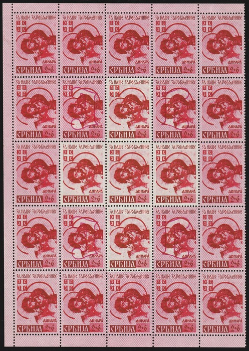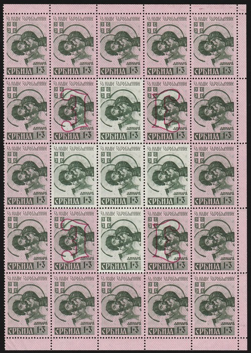 Charity 1st set 0.50+1.50 - 4+12D, all FULL PANES of 25, 5 in centre w/o underprint, 4 with 'E' (2 pointing right & 2 pointing left, rest with underprint pointing up), on ea blk. VF fresh MNH. Mi 54-57I-IV & 56VII-57AII cat €1070+ as singles,