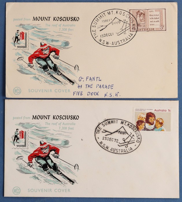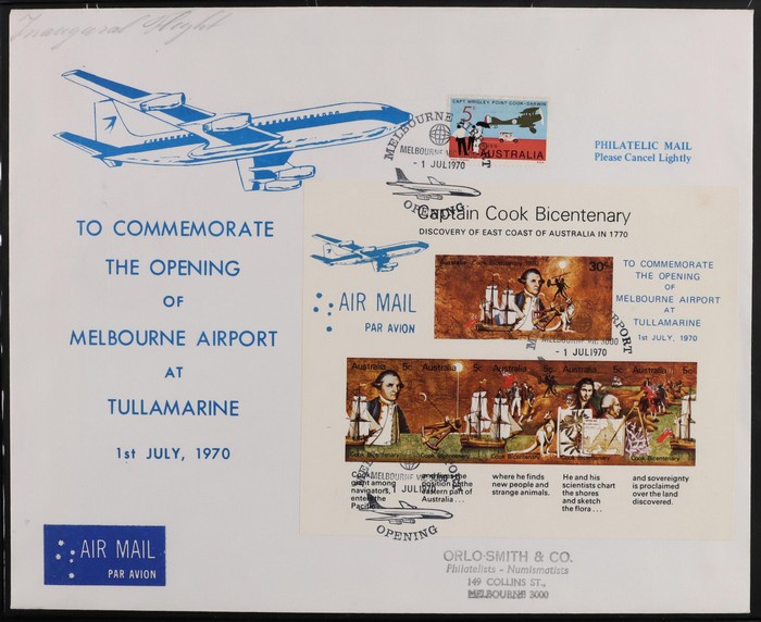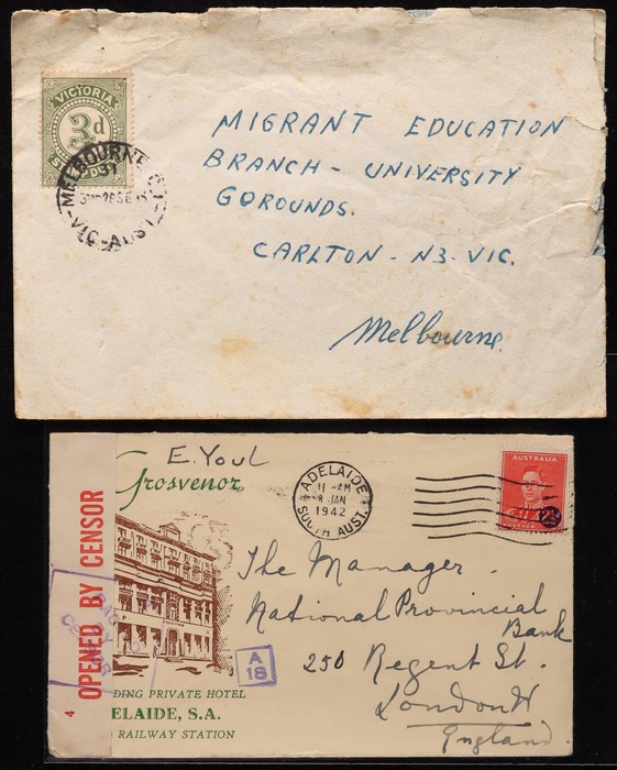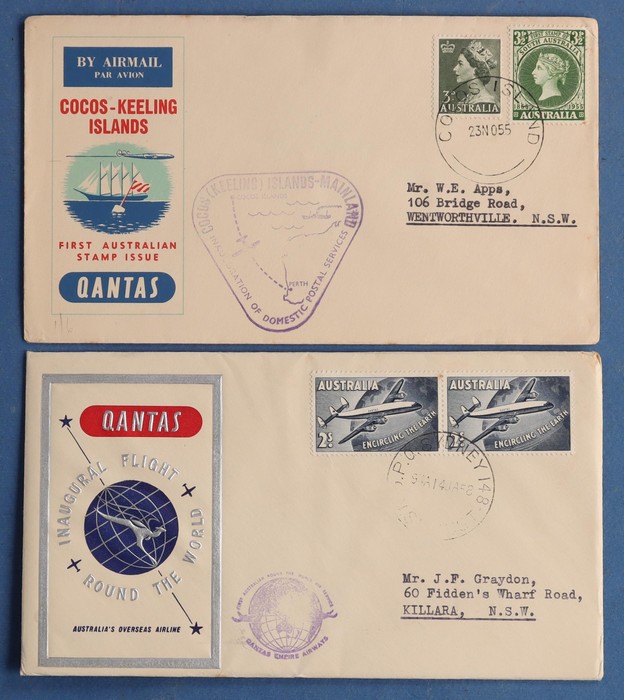 15th Anniv 2/- solo franking Melbourne to New York. 1954 Cobb & Co 2/- to Illinois. 1958 French Fair Melbourne pictorial pmk Reg to England. 1959-64 Flowers on individual Airmail envelopes. 1965 Registered cover franked 2/5 Bird cream paper, plus