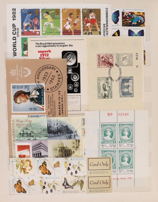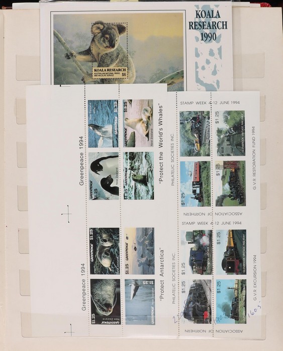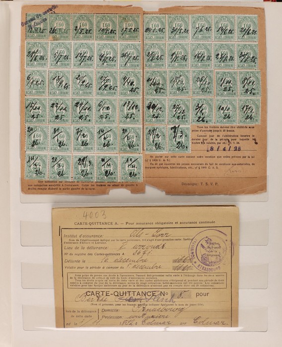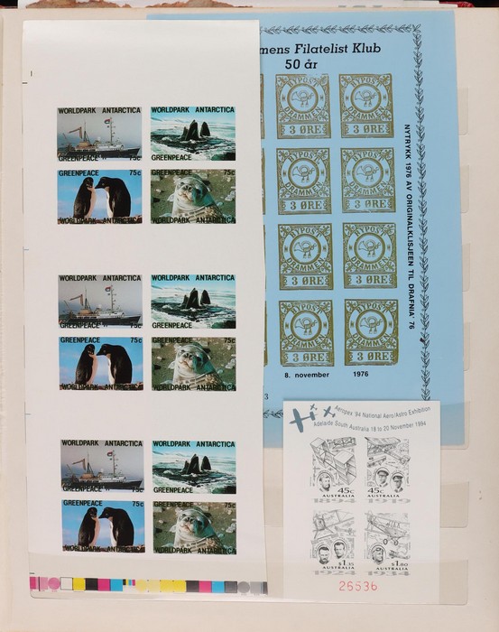 100, retail $500. 1911 Commonwealth essay reprint strips of 5 in 6 diff colours. World mix inc Alsace & Lorraine pre WWI Social Security Revenues (156) on 'Quittungscarte' cards. NZ 1980s/90s Greenpeace - Antarctica M/Sheet proof multiples. GB 1940s