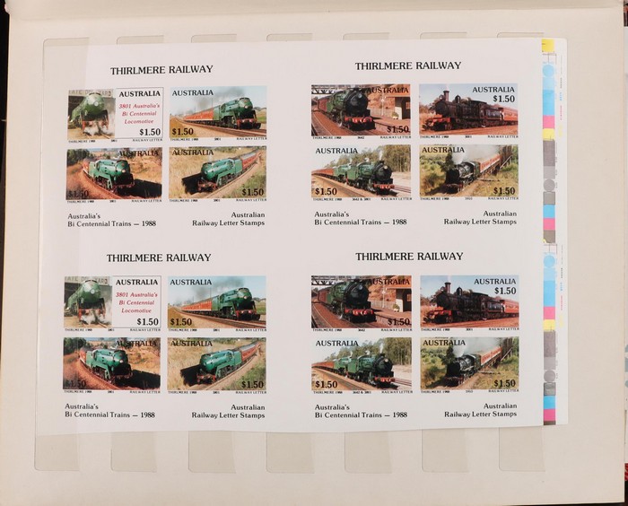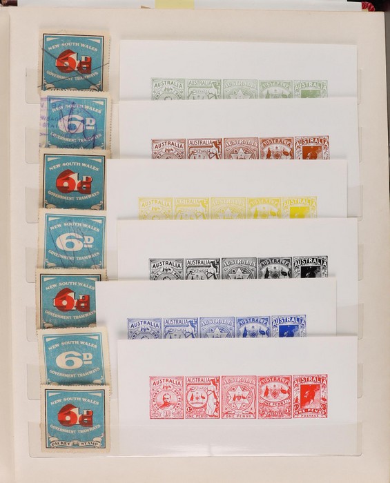Railway Local Post M/Sheets (21) inc SPECIMEN opts & IMPERF proofs. NSW 1950 Govt Tramway 6d blue Packet stamps (10). QLD pre-decimal Railway Parcel stamps (18) to 2/6 'Hollis Hopkins & Co' imprint. Australia 1971-75 decimal Coil Wrappers (6, cat