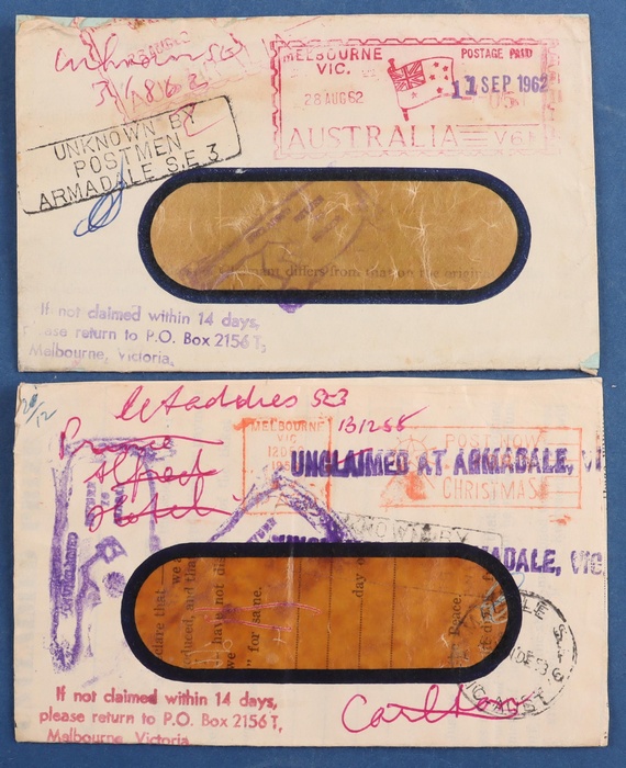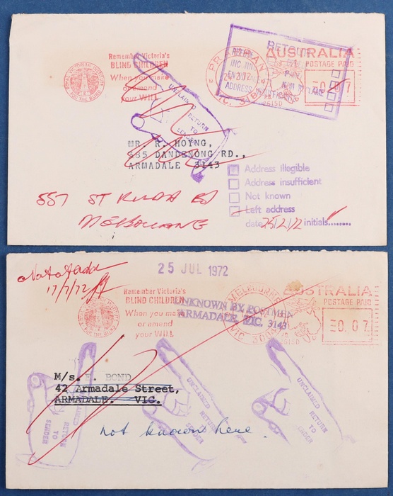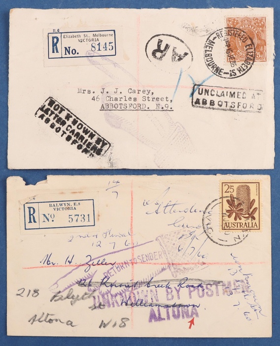 markings 1920s-90s of Melbourne and suburbs, amazing collection of covers, organised by suburb and date, now somewhat mixed, occasional m/s markings, but vast majority showing diff steel or rubber unclaimed, unknown, not known, left address, return