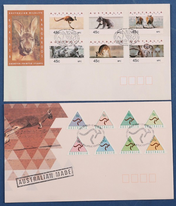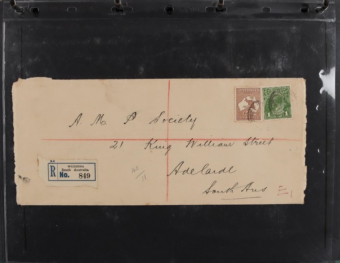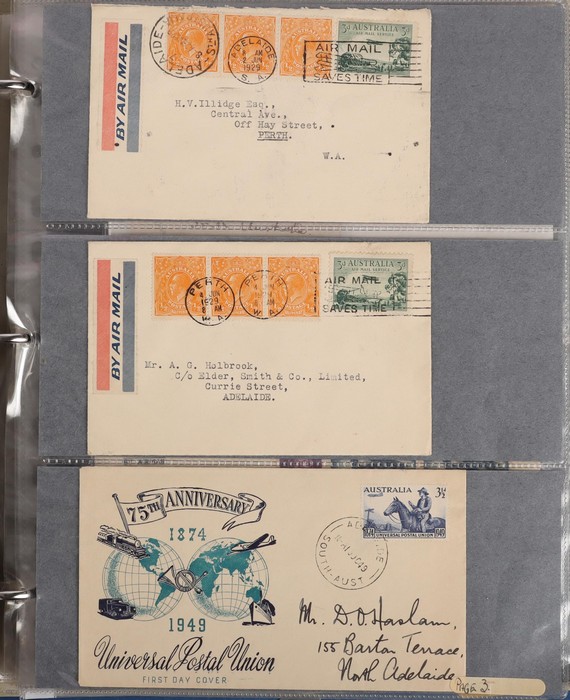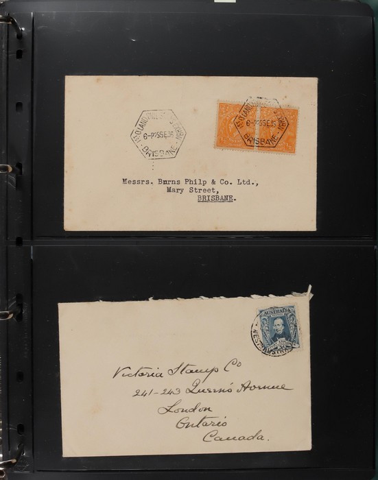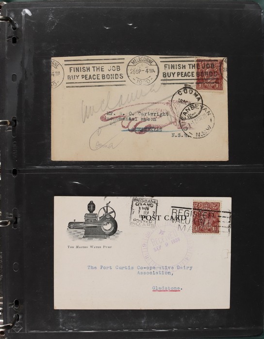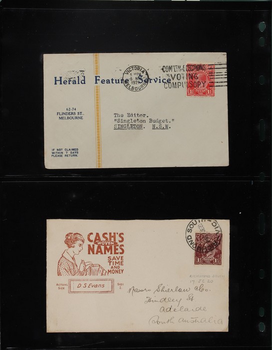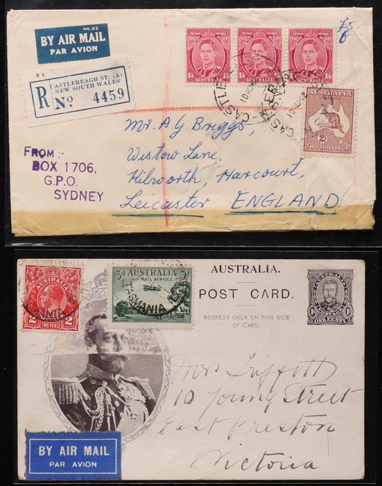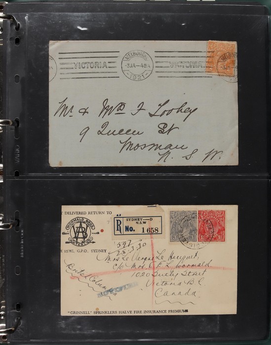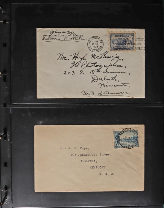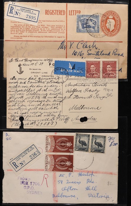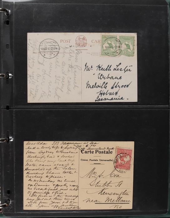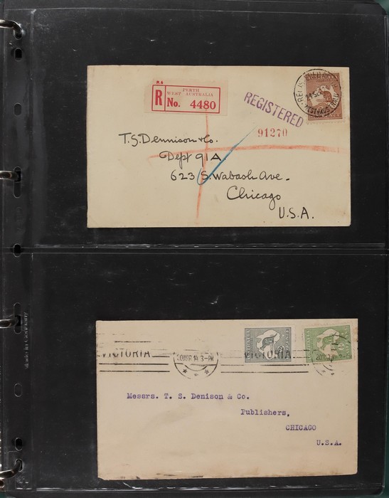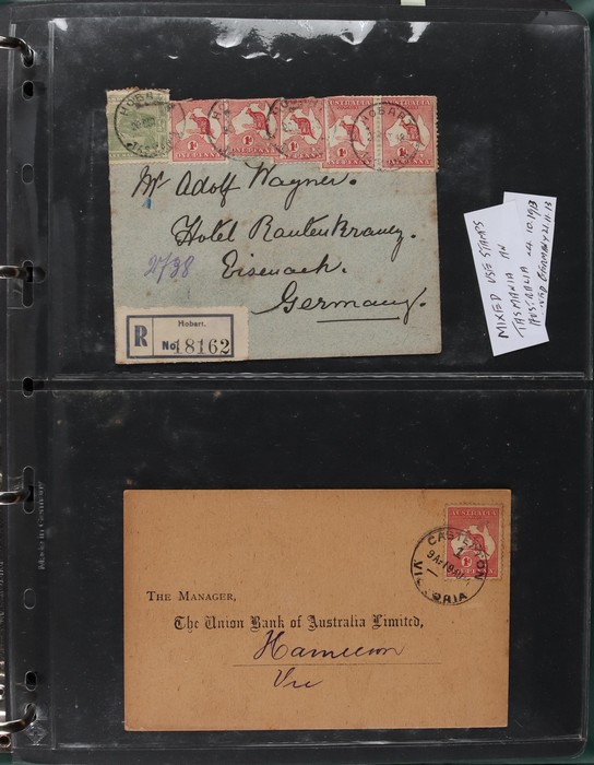 collection (100) with Kangaroos covers/cards (10) inc 1913 ½d pr on PPC to Hobart (cat $60), 1914 2d & ½d to Chicago (cat $275), 6d brown on 1924 Registered cover to USA (cat $250) & 1931 Registered to Adelaide franked SM wmk 6d brown &