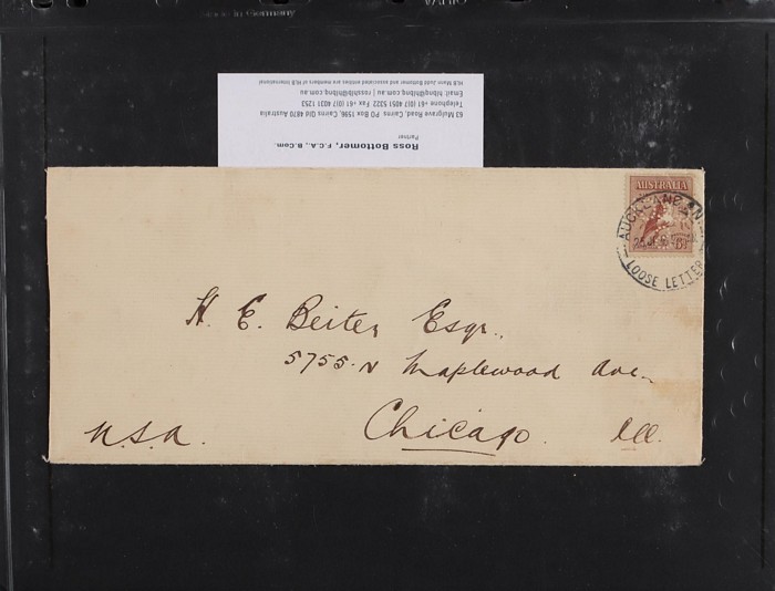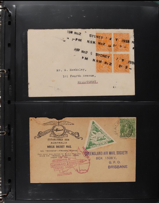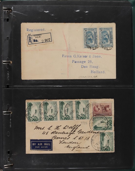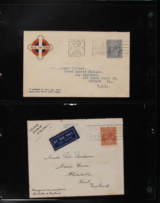 franked 1d green &1938 ½d orange blk of 4 from Sydney to Willoughby. Other covers of note inc 1934 VIC Cent 3d to Kentucky & 1935 Macarthur 3d to Minnesota. 1931 Registered Sydney to Holland franked Kingsford Smith 3d pr. 1935 Airmail Brisbane