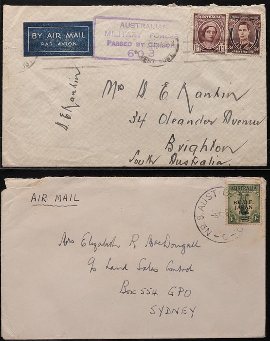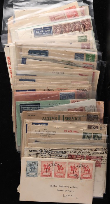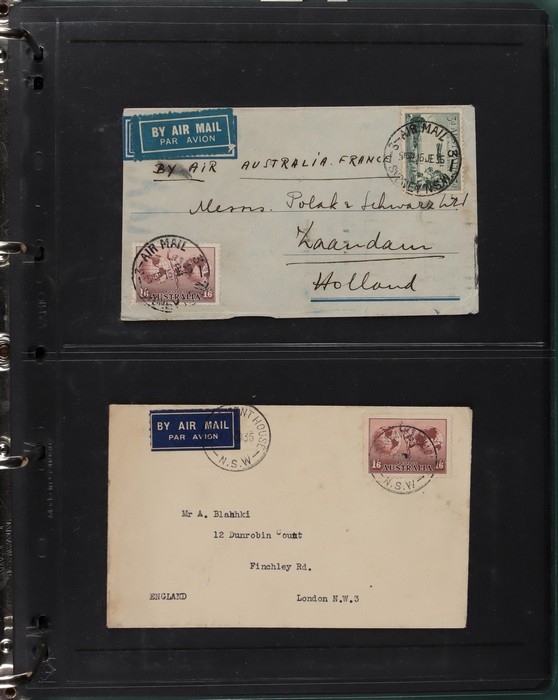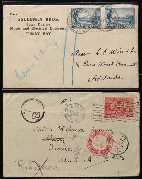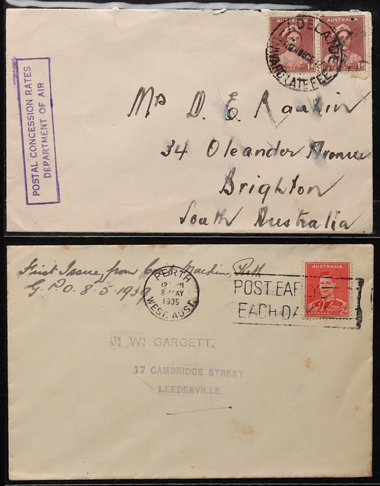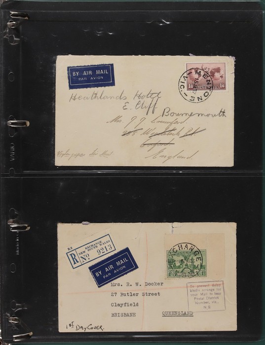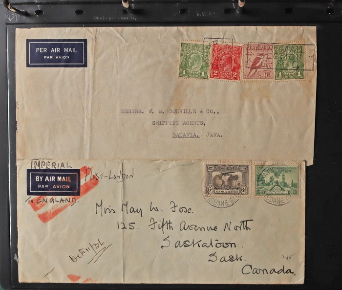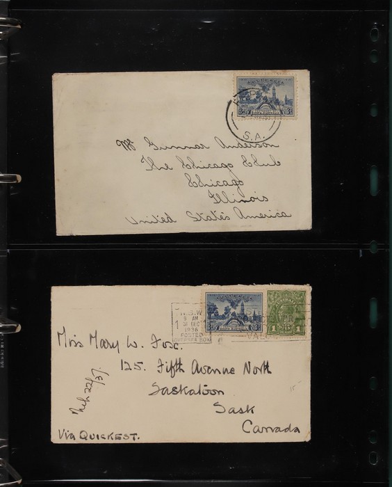 to London franked 1/6 claret & 3d green Airplane (6). 1936 SA 1/- green on FDC & 1936 Airmail envelope to Canada franked 6d brown Airplane & 1/- SA. 1937 Airmail from Mentone (VIC) to England franked 1/6 claret perf 11, no wmk. Plus many others, some