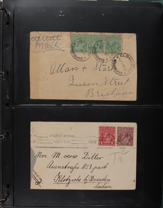 KGV 1d green. KGV covers (36) inc 1915-20 1d red solo, covers (6), 1919 1d red & 1½d brown to Dresden, 1924 1½d green trio Airmail from Cloncurry to Brisbane, 1927 3d & 1½d Registered to Canada, 1935 Queensland Rocket Flight