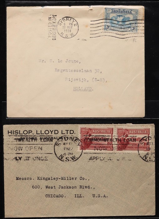 collection inc 1927 1½d Canberra to USA (3), 1931 3d Kingsford Smith 'Posted In Overseas Box GPO' to Holland, 1934 3d (2) VIC Centenary with hand written 'Express Delivery', 1935 Airmail cover to Finland with VIC Centenary 3d (2), 1/- (3),