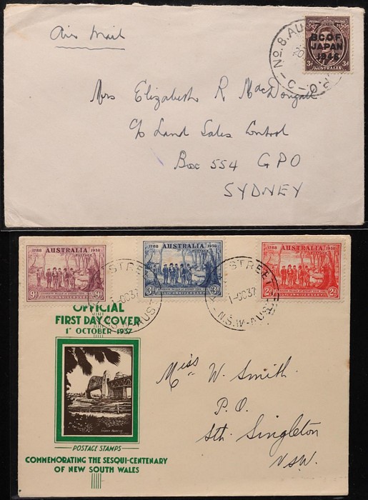 (3, cat $150). 1945 Gloucester & 1947 Newcastle sets on separate covers. 1946 Kangaroo 2/-Die II strip of 4 on Airmail cover Adelaide to Boston. 1951 Federation 1/6 Mackay to Chicago. 1953 Coronation & 1954 RV sets on individual covers. 1953 Tasmania