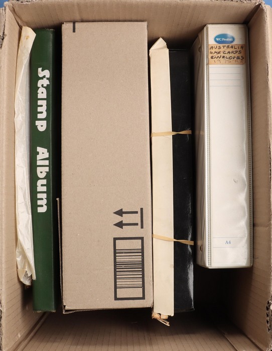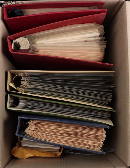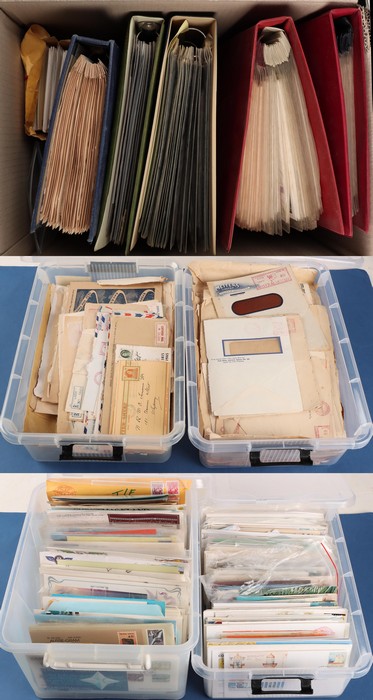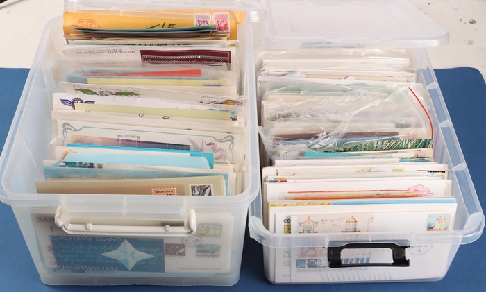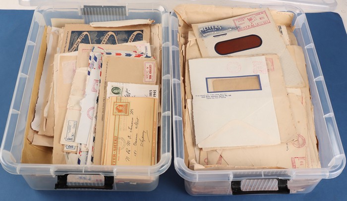 correspondence to NRMA Insurance Co Sydney. Untouched in decades with a bit of a musty smell, neatly packed into 2 plastic tubs. Finally another 2 plastic tubs with 1980s covers inc Philatelic Exhibitions, Pacific Island PO Packs, mixed modern PPC &